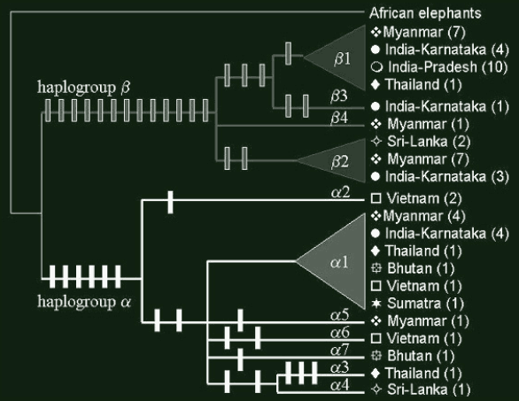 At a phylogenetical level, we show that these haplotypes segregate in two distinct assemblages (or haplogroups). These haplogroups, called α and β (fig.2), had already been found by Fernando et al. (2000) with similar data obtained for a wide sample of elephants (but with no data from Myanmar). A deep discontinuity is thus observed within Asian elephants.